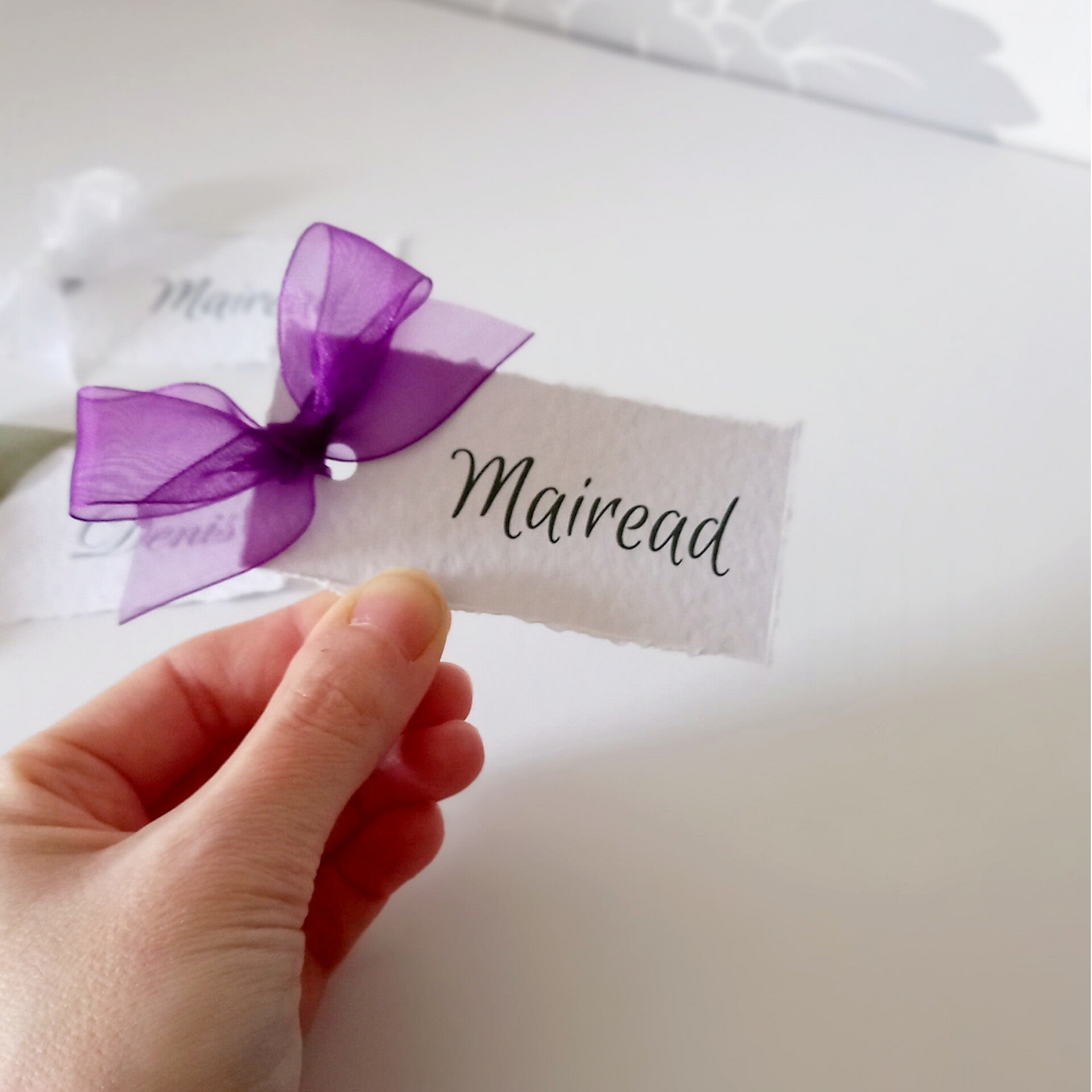 Wedding Table Guest Name Cards – Deckle Edge Style with Organza Ribbon Bow