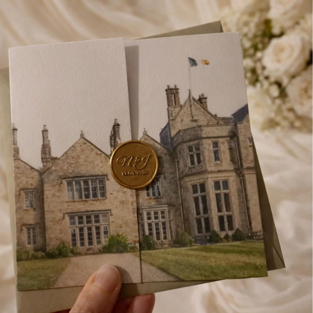 A beautifully crafted gatefold wedding invitation, thoughtfully designed to create a lasting first impression. The front features a bespoke illustration, delicately printed on premium Gesso 300gsm textured cardstock, setting the tone for a refined and romantic celebration.